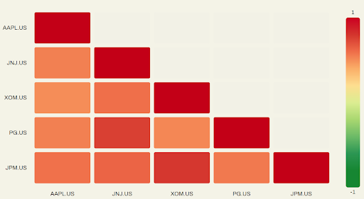 La seguente matrice di correlazione mostra come tutti i titoli siano positivamente correlati. La coppia meno correlata è Exxon/Apple che registra una correlazione positiva pari a 0.31.