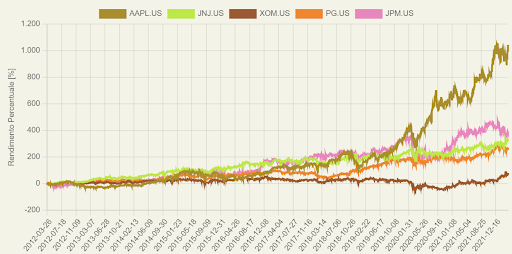 L’analisi di confronto mostra come su un periodo di 10 anni Apple abbia sovraperformato nettamente gli altri titoli decuplicando di fatto il proprio valore a fronte però di una volatilità più pronunciata. Volatilità da non sottovalutare anche per JPMorgan. Johnson & Johnson e Procter & Gamble hanno avuto una crescita più lineare mentre ha “sofferto” di più, rispetto agli altri titoli, ExxonMobil.