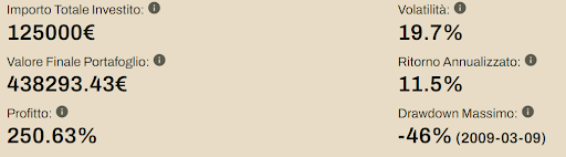 Vediamo che sul lungo periodo l’elevato rischio, quantificabile con una volatilità del 19.7% del portafoglio, abbia restituito un notevole profitto di circa il 250% (11.5% annualizzato). A fronte quindi di un investimento accumulato di 125k€ il valore attuale si trova a circa mezzo milione. Sul lungo periodo è visibile anche l’effetto benefico dell’interesse composto, parte destra del grafico dove si vede un esponenziale distacco della curva valore portafoglio (marrone) e capitale investito (verde). Notiamo anche come il massimo drawdown durante la crisi sub-prime sia pari a -46%.