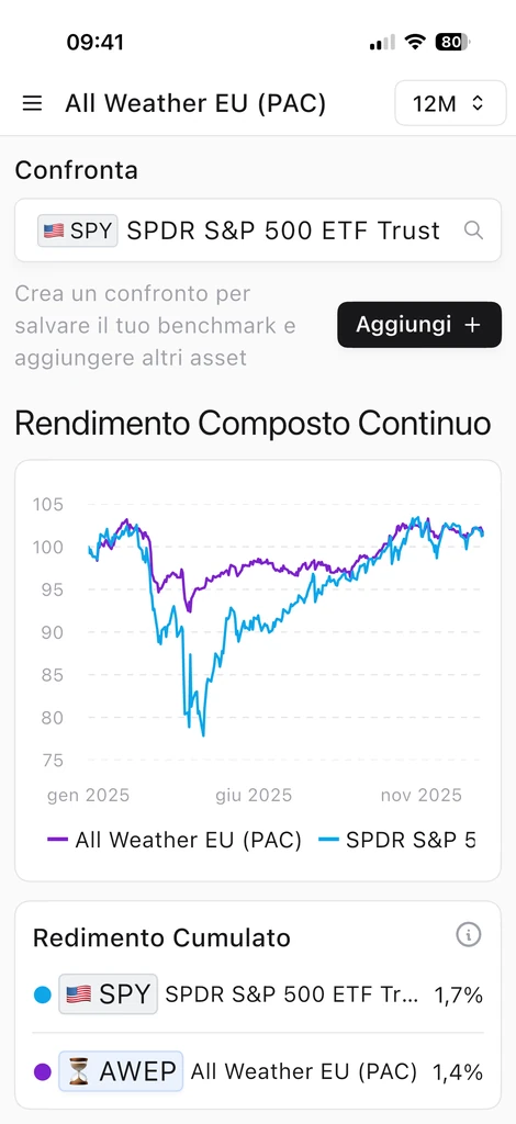 Inoltre, per ogni portafoglio monitorato o simulazione backtest puoi confrontare direttamente i risultati contro un benchmark nella sezione Confronto della pagina portafoglio/simulazione. Qui vedi sia gli andamenti nel tempo sia le metriche principali a confronto.