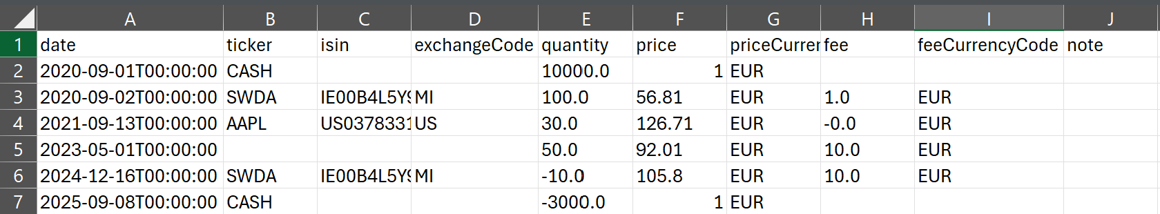 date,ticker,isin,exchangeCode,quantity,price,priceCurrencyCode,fee,feeCurrencyCode