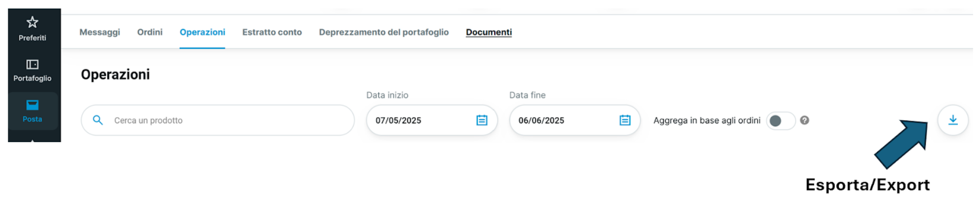 🇮🇹 Movimenti → Tutti i movimenti → Inserimento “Data Inizio” e “Data Fine” → Esporta → File separato da virgole (CSV)