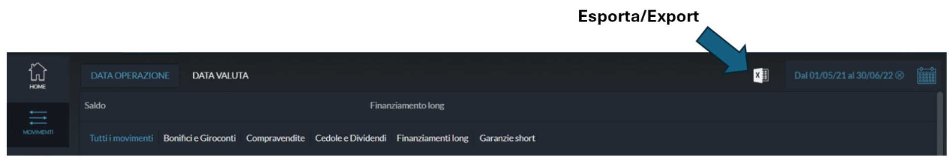 Movimenti → Tutti i movimenti → Inserimento Data Inizio e Data Fine → Esporta → File separato da virgole (CSV)