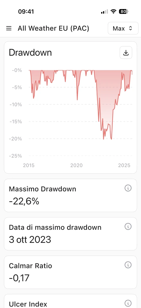 - Calmar ratio: rapporto tra rendimento e drawdown massimo.