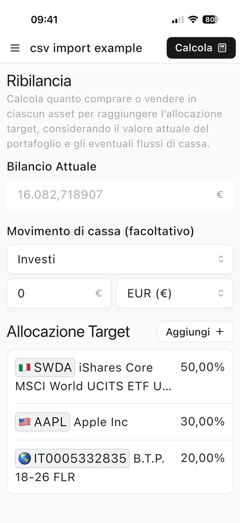Su Wallible hai l’opportunità di calcolare le transazioni di acquisto/vendita da effettuare per ogni titolo in portafoglio in base all’asset allocation desiderata. Questo ti permette di passare rapidamente dall’analisi alla pratica, con indicazioni chiare su come riallineare i tuoi portafogli monitorati.